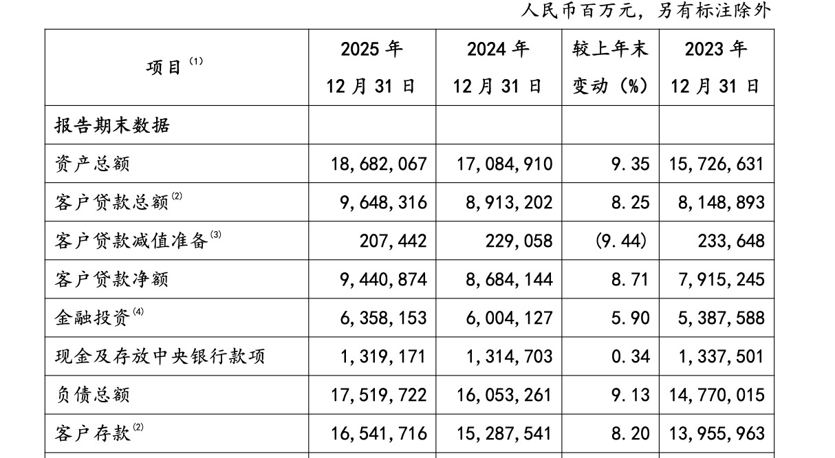 业务发展层面,零售业务仍是该行核心业务板块,截至2025年末,个人客户资产管理规模(AUM)突破18万亿元,同比增长9.64%。普惠金融领域,普惠小微贷款余额1.80万亿元,涉农贷款余额2.51万亿元,持续推进服务下沉,覆盖小微企业及乡村领域。养老金融领域,该行推进“三横三纵”养老金融体系建设,布局个人养老金、养老理财等相关业务。公司金融与资金业务协同发展,截至年末,客户融资总量(FPA)余额达6.79万亿元。