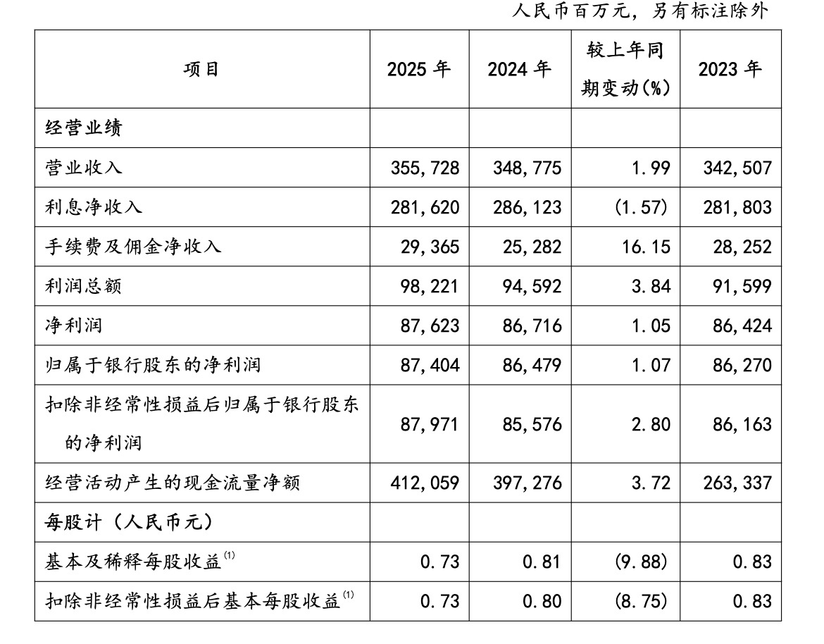利息收入方面,受2025年市场利率下行、LPR下调及存量房贷利率调整等因素影响,该行利息净收入出现小幅下滑,全年实现利息净收入2816.20亿元,同比下降1.57%。净息差为1.66%,较上年末收窄0.21个百分点,不过从全年走势来看,利息净收入降幅逐季收窄,息差压力呈现边际缓解态势。